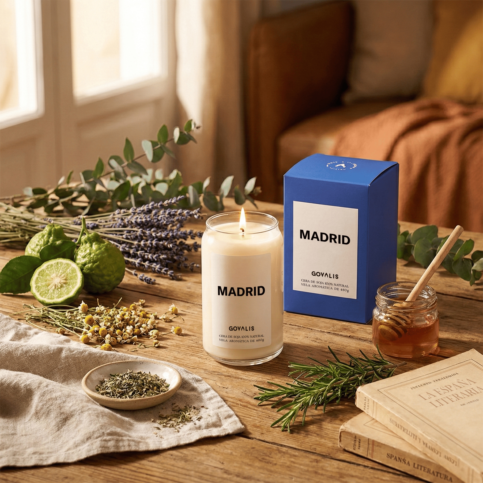 Una vela de aroma fresco, herbal y elegante, inspirada en la energía vibrante de la ciudad de Madrid. Las notas altas de bergamota y manzanilla aportan luminosidad y suavidad desde el primer instante. En el corazón, la lavanda y el eucalipto llenan el espacio de frescura limpia y equilibrada. El fondo de romero, pachuli y flor de miel añade carácter y calidez, dejando una estela sofisticada y envolvente.